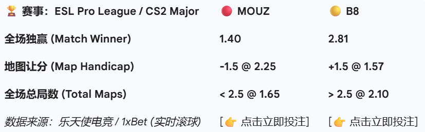 比赛时间: 今日凌晨 03:30 (GMT+8) 核心盘口: MOUZ (1.40) vs B8 (2.81)