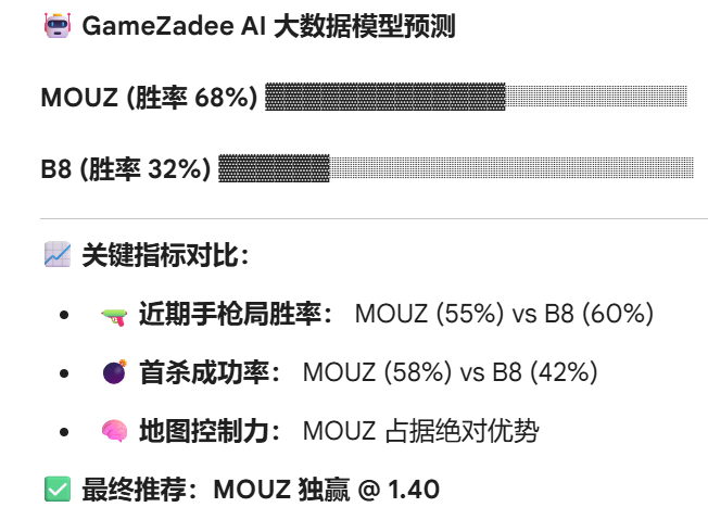 是 B8 延续手感一黑到底,还是 MOUZ 终结黑马之路?Gamezadee 的 AI 模型为您带来最新数据分析。