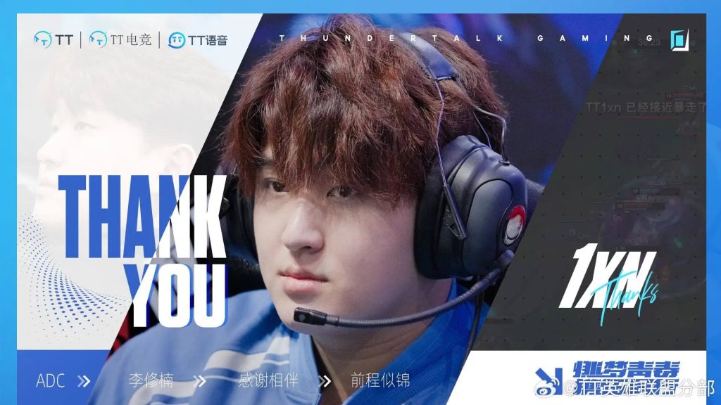 经双方友好沟通与协商,原TT英雄联盟分部AD选手李修楠(ID: 1xn)断开连接,即日起正式离队。